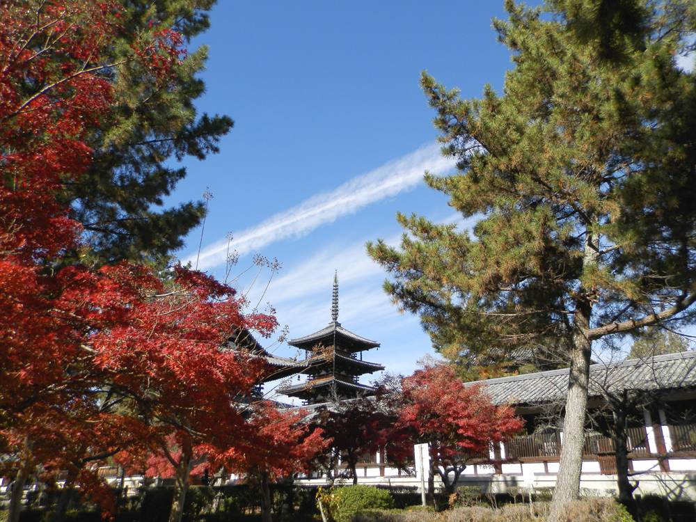 青空、雲、紅葉、五重搭