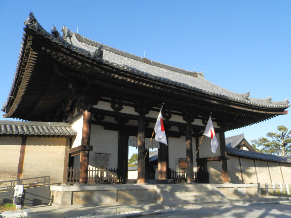 日の丸が掲げられた南大門 ( なんだいもん )