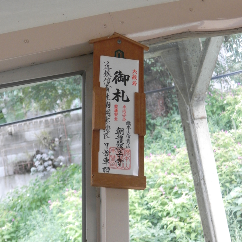 ケーブルカーの運転席には、朝護孫子寺のお札が祀られていました
