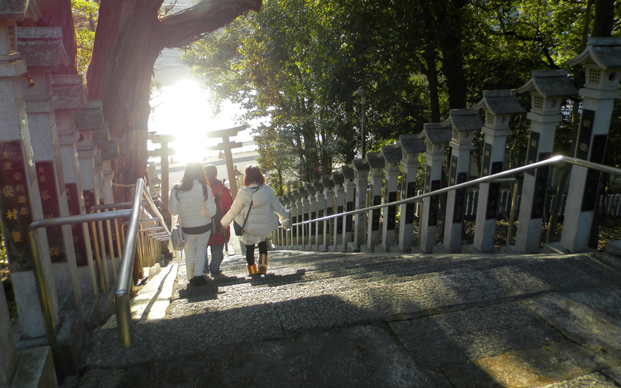 天満池の陽の光、鳥居、階段、灯篭、木々、すべてが美しい