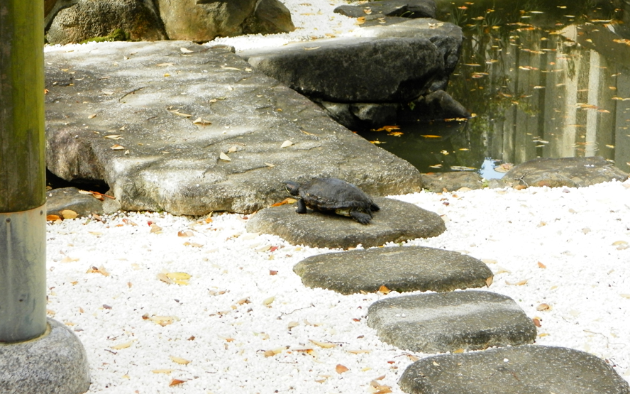 亀さんが水神社の参道を、鳥居の方から神殿に向かって歩いていきました